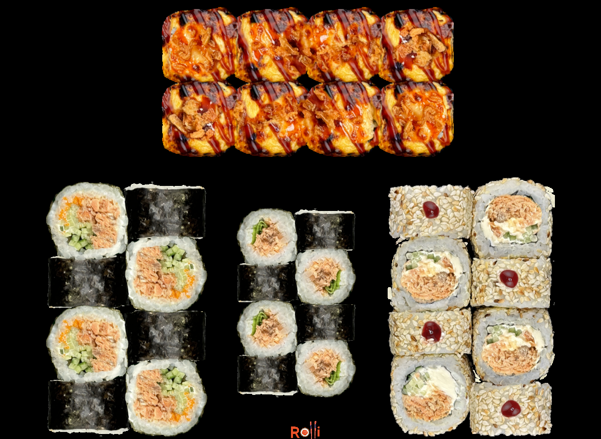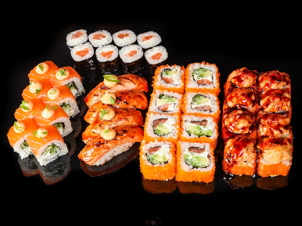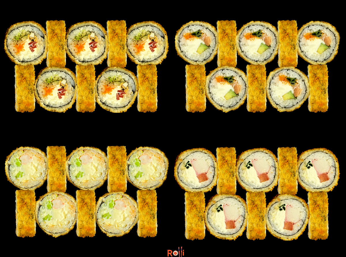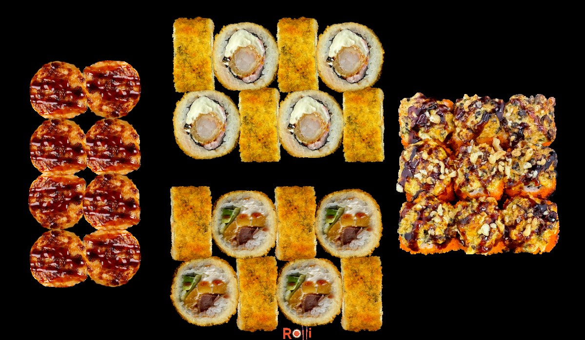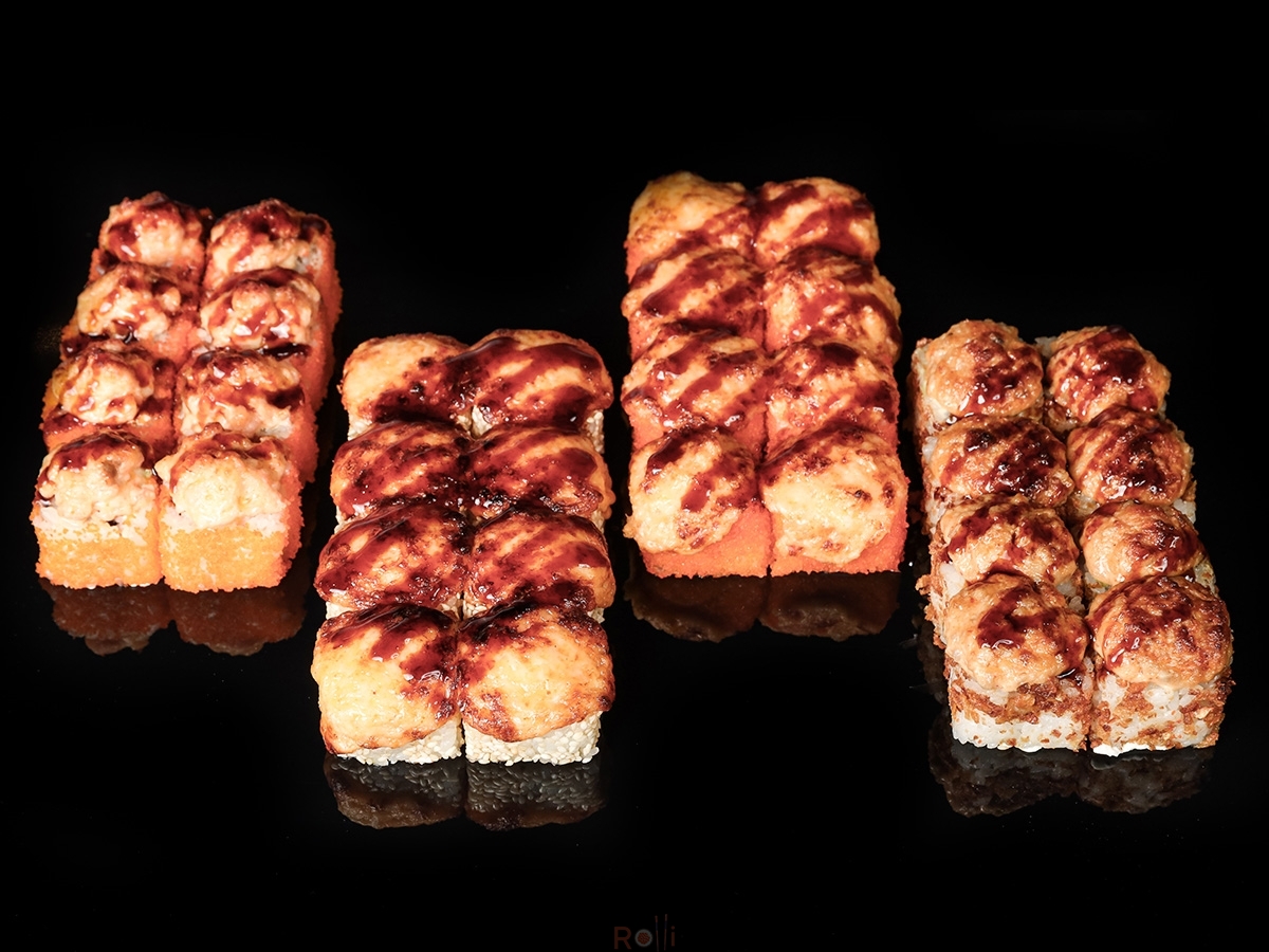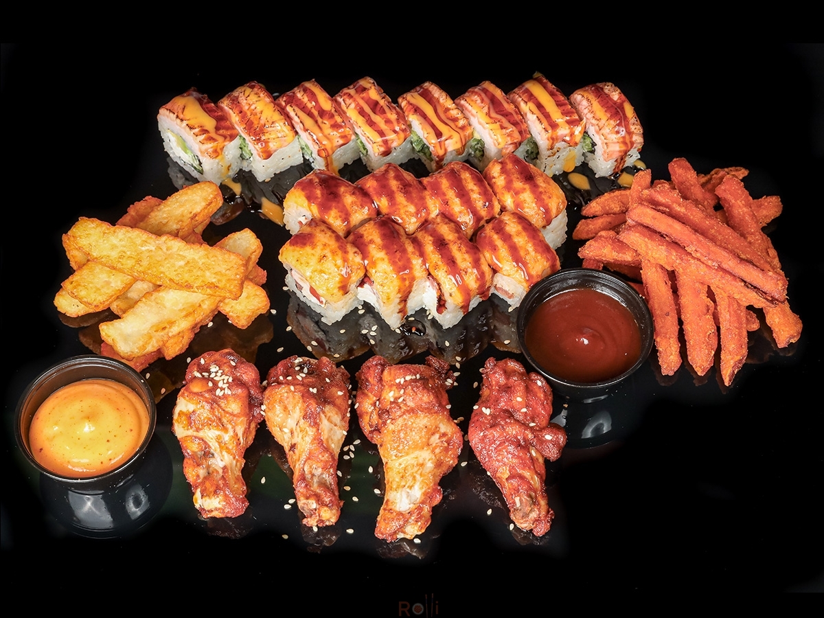 Cepts Halumi siers, saldie kartupeļi frī ar parmezānu, vistas spārni, Fire philadelphia maki, cepts rolls ar tīģergarnelem, tomātu un siera mērci.